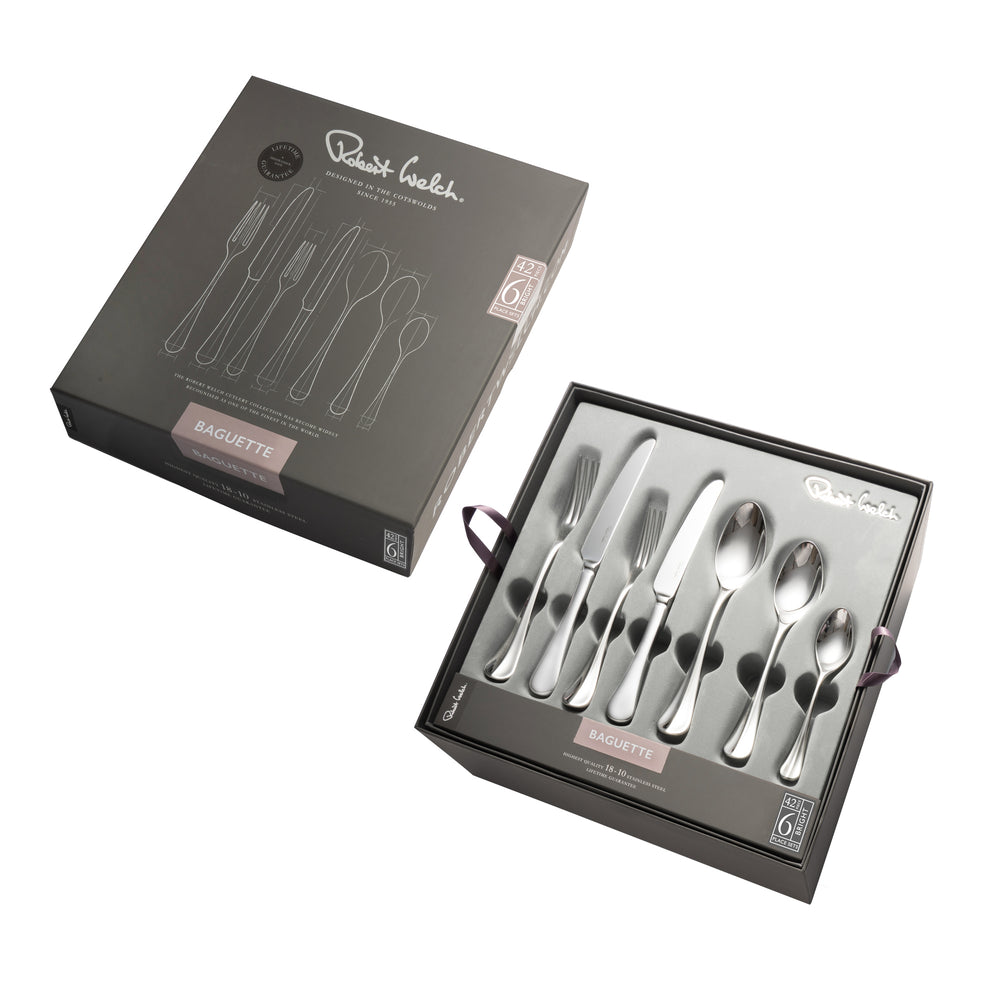 Baguette Bright cutlery is perhaps one of the most familiar in dining settings: a classic shape with traditional connotations. Comfortable and well balanced in the hand, the pebble smooth finish feels soft to grip, Robert Welch Baguette Bright cutlery offers a traditional look with a modern finish.
