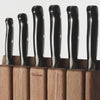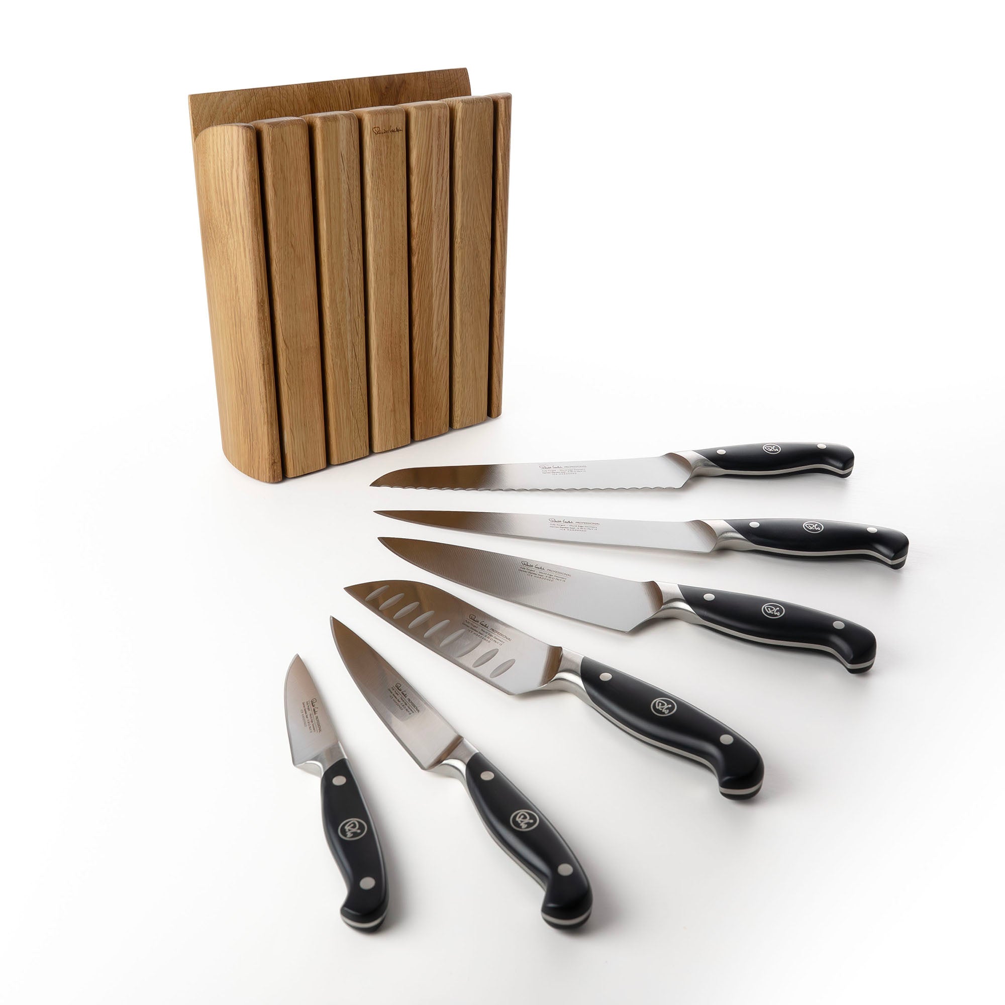 Enhance your kitchen knife storage with our Professional Book Oak knife block set, an effective space-saving solution. Made from durable solid oak on stable silicone feet and designed to hold six kitchen knives, the block has been designed to safely store your kitchen knives with the blade to the front, so they are the right way round to reach for, remove and use.